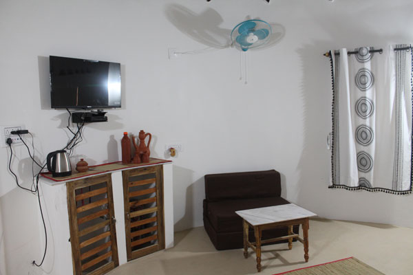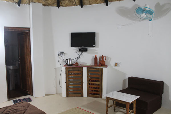 We have 03 double bed cottages with attached western toilets and 01 Four-Bed Family room with 02 attached western toilets. There is a separate Sitting room with our Four Bedded room. All our rooms have Air Conditioning, King size comfy beds, Mini Fridge, Sofa cum-bed, Geyser, Electric Kettle, TV, Mini Wardrobe and Power backup. We serve sumptuous Bengali food to our guests at our Dining Hall.