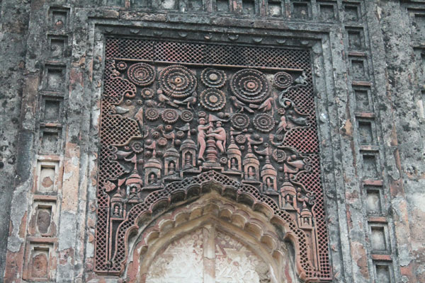 The local history of Kalikapur Rajbari estimates its age to be somewhere around 350 years but researcher Jaggeshwar Chowdhury mentions in his book, Burdwan: Itihas O Sanskriti – Volume 3, that the year of establishment was 1819. However, all agree that Sadgope Zamindar Paramananda Roy initially established this Zamindari at nearby Maukhira Village but later moved to Kalikapur due to the intriguing problem of annual monsoon floods in Maukhira. After settling down in Kalikapur, Paramananda constructed 07 mansions for his 07 sons alongwith a Durgadalan and a Nat Mandir. Such mansions are referred to in the local dialect as “Saat Mahala Bari” (mansion with seven parts). All these 07 mansions were connected to each other through a long corridor.