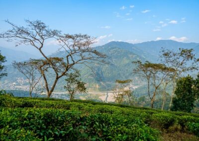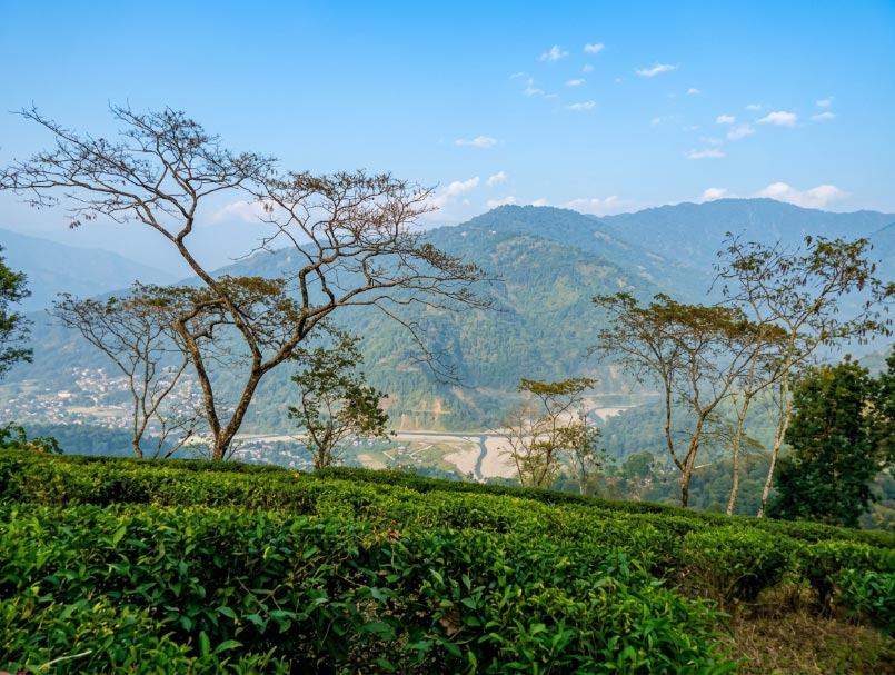 The area’s beauty is defined by its dramatic borders – the ancient, wild Sum and Raniban Forests on one side, and the Shree Dwarika Tea Garden Tea Estate on the other, which cascades down to the banks of the Rangeet River.